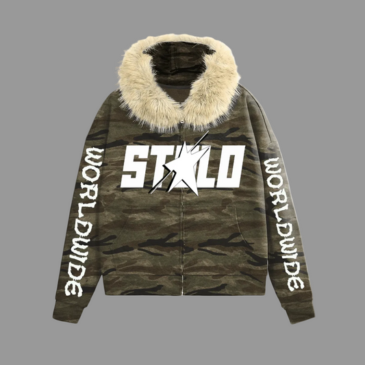 Stolo Clothing Co STARCHILD X WORLD WIDE Unisex Heavyweight Camo Detachable Fur Double Zip-Up Hoodie (400GSM)