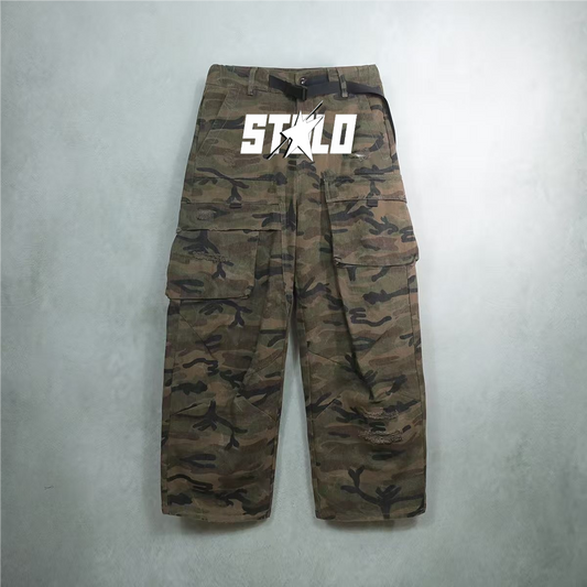 Stolo Clothing Co Essential Unisex Camouflage Distressed Baggy Cargo Pants w/ Belt