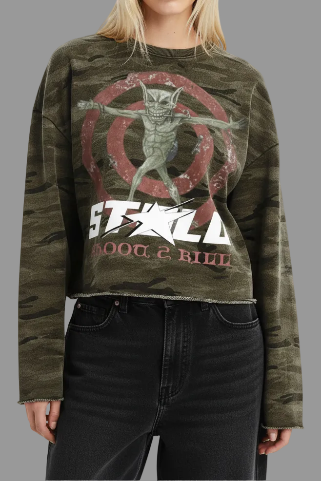 Product overview: Stolo Clothing Co SHOOT 2 KILL Camo Cropped Heavyweight Long Sleeve Tee in a rugged camo print, crafted for serious streetwear performance and everyday comfort. This cropped long sleeve tee blends utility with style, featuring a heavyweight fabric and precise detailing that elevate your wardrobe.